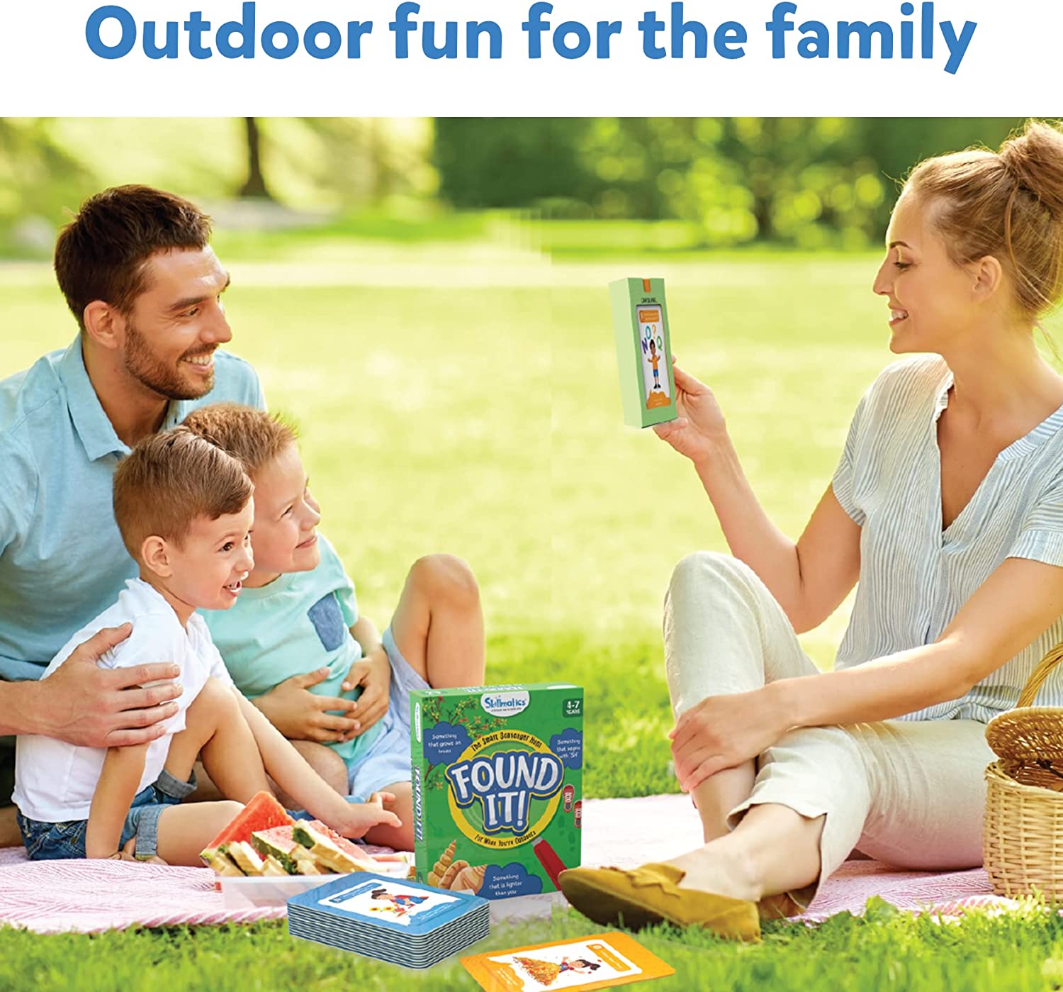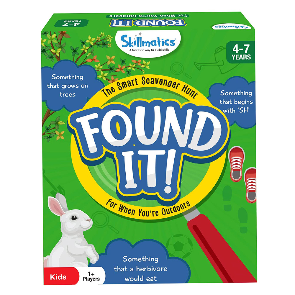 • OUTDOOR SCAVENGER HUNT – Found it! is an exciting outdoor game that helps children learn as they go on the most exciting ‘Search & Find’ with prompts like Can you find…”Something that is heavier than a leaf? Something round?” etc.! Players must shout “FOUND IT!” as soon as they get their hands on the object! The first one to win 7 cards wins the game!